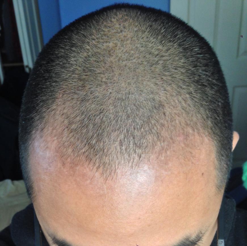 The shaved head pictures are recent and the the pictures with my hair grown out are from about a year ago and show how my hairline is recessed and uneven.
