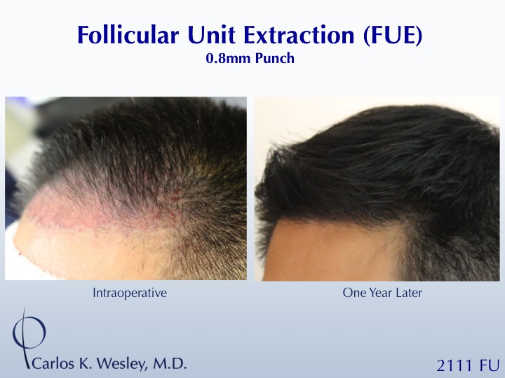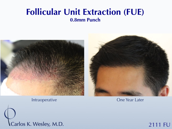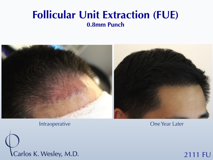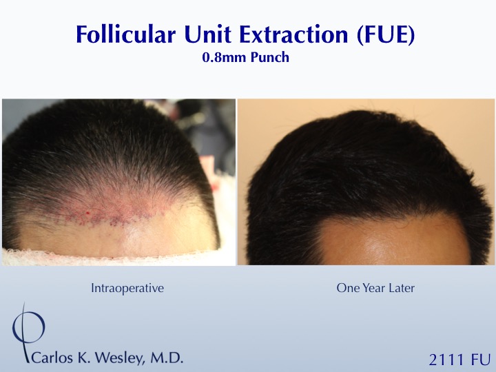 This 36-year-old man underwent a follicular unit extraction (FUE) session with Dr. Carlos K. Wesley in which a total of 2111 grafts were placed.