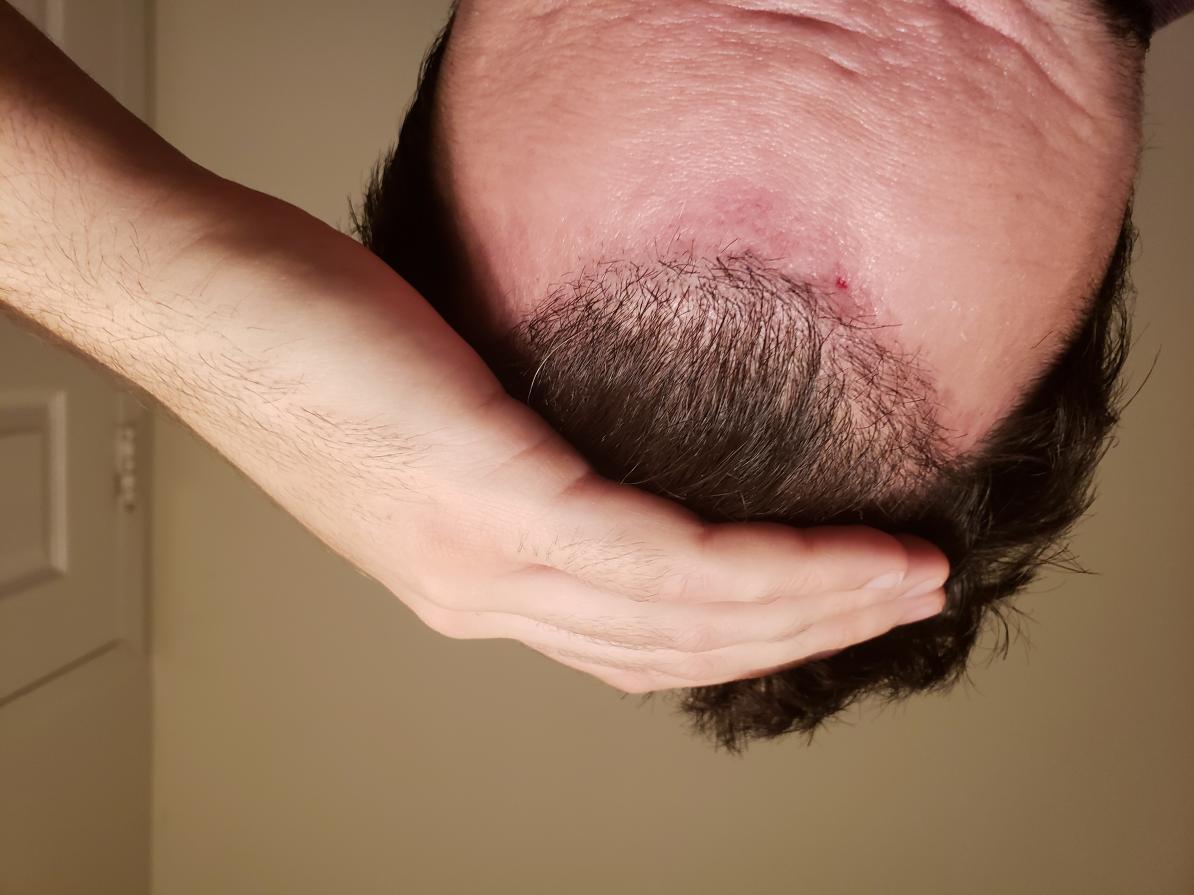 At the end of this, it was decided my hairline was created too low, with far too little density, along with grafts being thicker one hair grafts then he would have used. He later told me the procedure was more complex then he expected because of the high density I was looking for, the tough scar tissue, and over 200 grafts having to be removed all along my hairline with electrolysis to really clean it up and create a more appropriate hairline to match my head shape and facial structure. I can already tell! (those are the red splotches at the front). I'd prefer a higher hairline with more density any day over a lower one and thankfully he agreed.