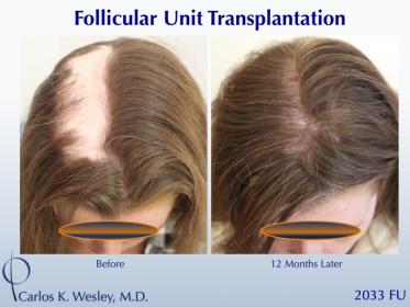 She underwent a follicular unit transplantation (FUT) session with Dr. Carlos K. Wesley in which a total of 2033 grafts were placed.