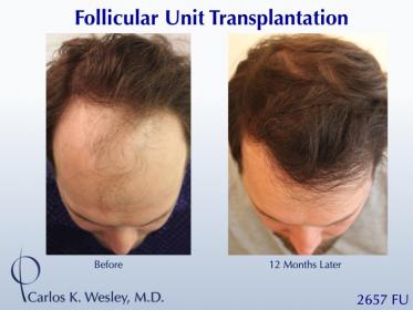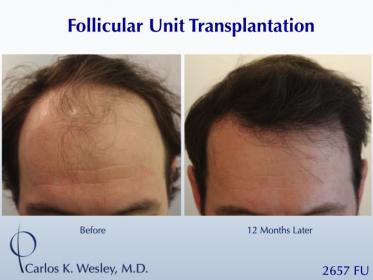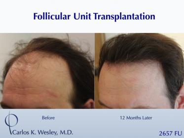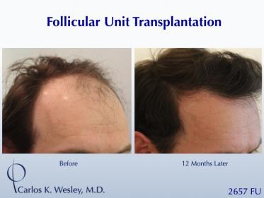 This patient underwent a follicular unit transplantation (FUT) session with Dr. Carlos K. Wesley in which a total of 2657 grafts were placed.