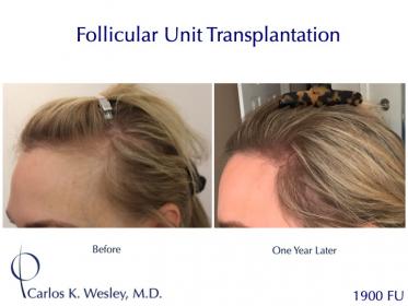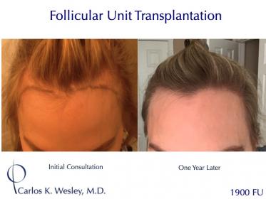 This female patient underwent a follicular unit transplantation (FUT) session with Dr. Carlos K. Wesley in which a total of 1900 grafts were placed