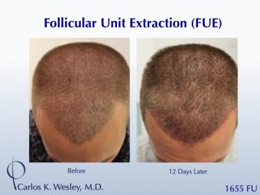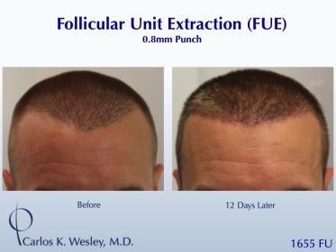 This patient underwent a follicular unit extraction (FUE) session with Dr. Carlos K. Wesley in which a total of 1655 grafts were placed