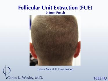 The patient returned 12 days after the procedure and images of the patient can be seen below. This link illustrates the timing of hair growth after surgery. Similar patient hair transformations with Dr. Wesley and his team may also be viewed.