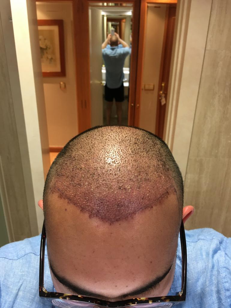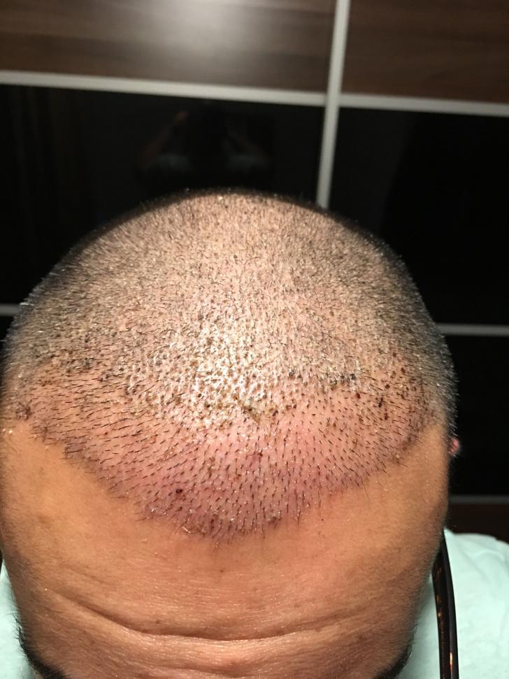 5 months post-op pimple type spots start to appear initially localised to the frontal area but then also in the mid scalp area and the doctor issues more topical antibiotic to treat them and the pimples subside over the course of the next few months and remnants of redness in the frontal area seems to subside at around 7/8 months post-op. The topical antibiotic is discontinued as there is no pimples appearing..