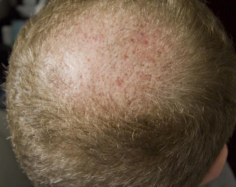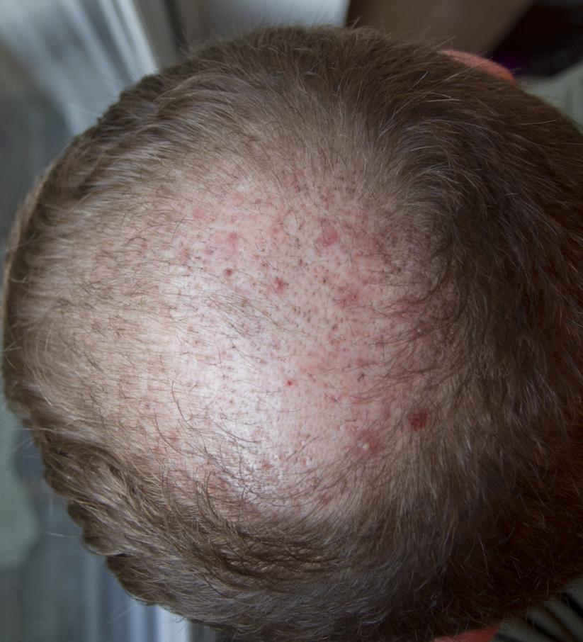 You can see the current redness and I think I note some pitting and cobble-stoning, visible on the left side, and all over with stronger light. The scalp still hurts in a few spots and seems to be slightly swollen, although I cannot be sure about the latter.