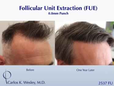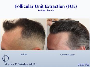 This patient underwent a follicular unit extraction (FUE) session with Dr. Carlos K. Wesley in which a total of 2537 grafts were placed
