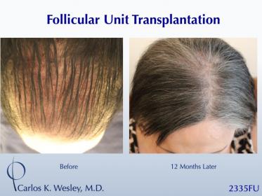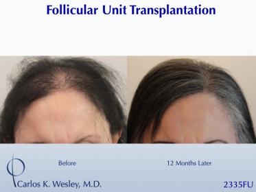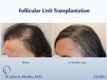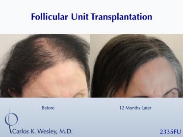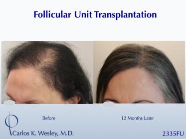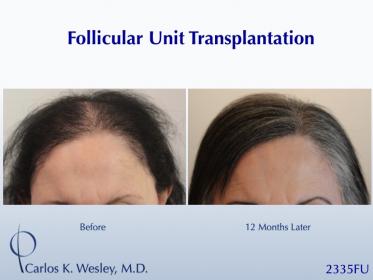 This female patient underwent a follicular unit transplantation (FUT) session with Dr. Carlos K. Wesley in which a total of 2335 grafts were placed