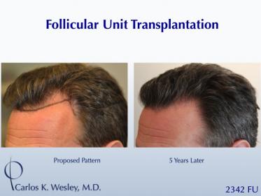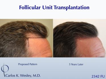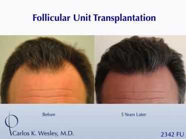 This patient underwent a follicular unit transplant (FUT) session with Dr. Carlos K. Wesley in which a total of 2342 grafts were placed