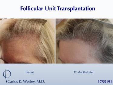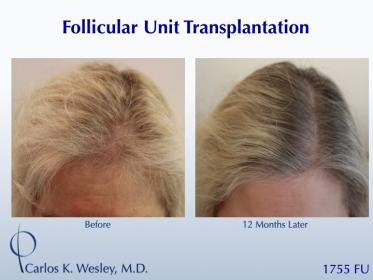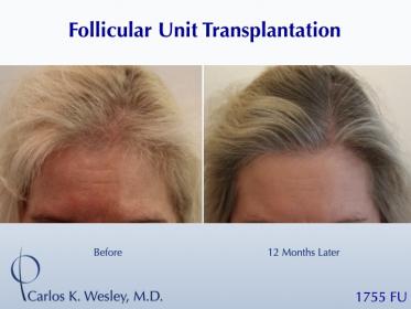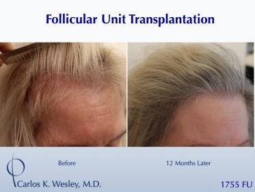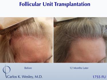 This female patient underwent a follicular unit transplantation (FUT) session with Dr. Carlos K. Wesley in which a total of 1755 grafts were placed