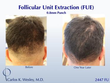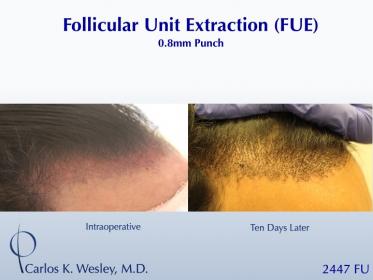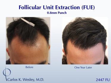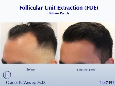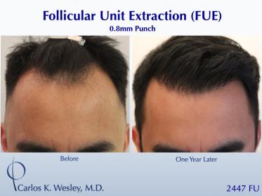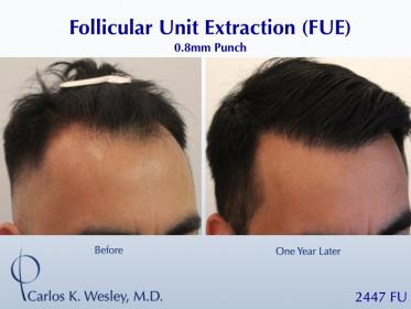 This patient underwent a follicular unit extraction (FUE) session with Dr. Carlos K. Wesley in which a total of 2447 grafts were placed.