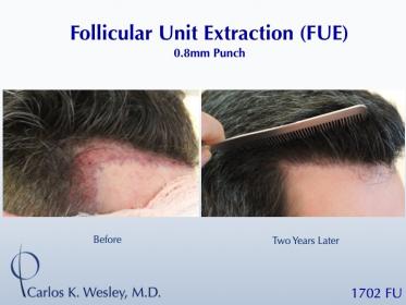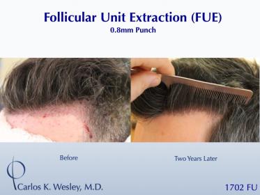 This patient underwent a follicular unit extraction (FUE) session with Dr. Carlos K. Wesley in which a total of 1702 grafts were placed.