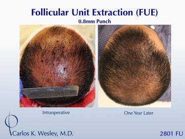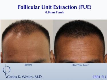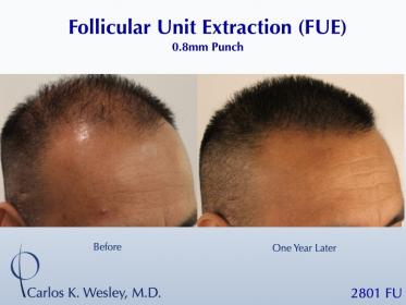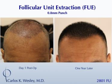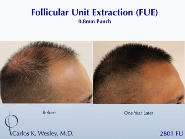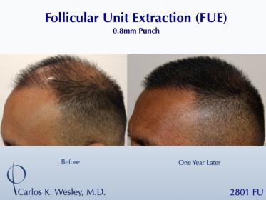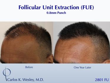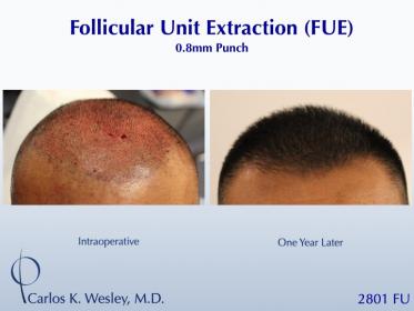 This patient underwent a follicular unit extraction (FUE) session with Dr. Carlos K. Wesley in which a total of 2801 grafts were placed
