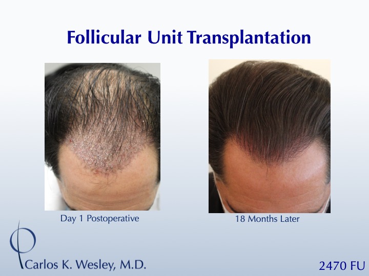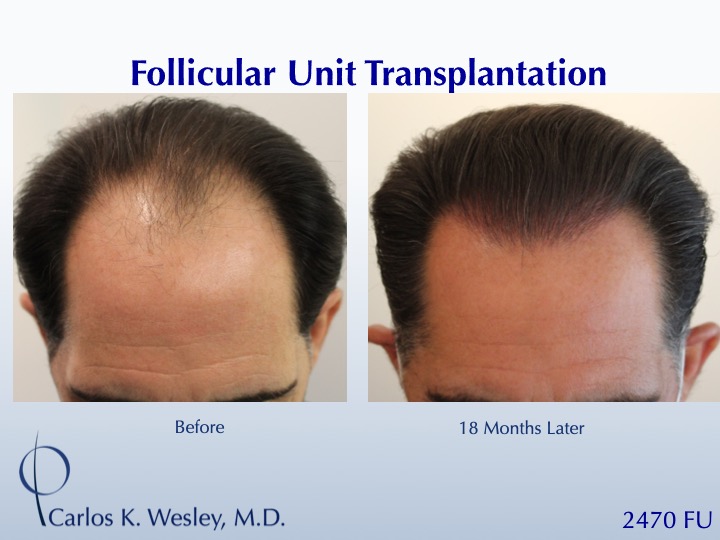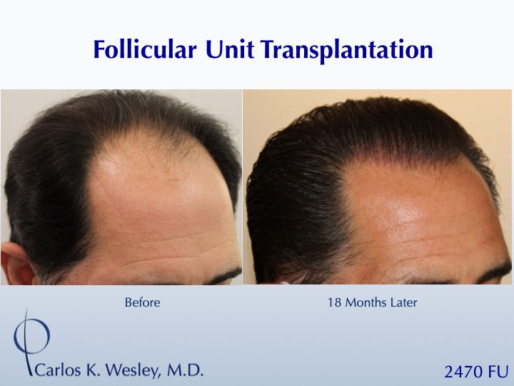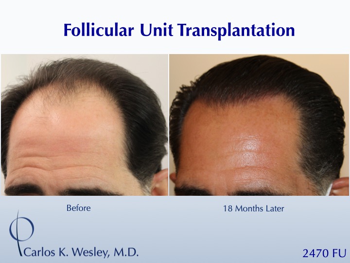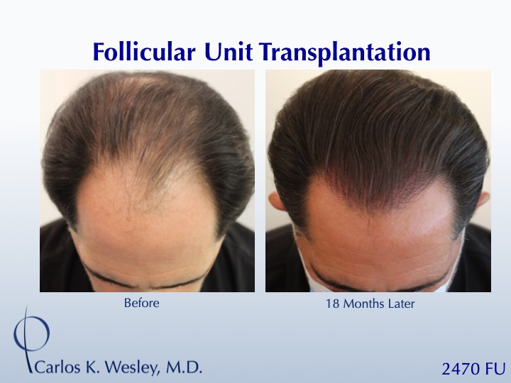 This patient underwent a follicular unit transplantation (FUT) session with Dr. Carlos K. Wesley in which a total of 2470 grafts were placed
