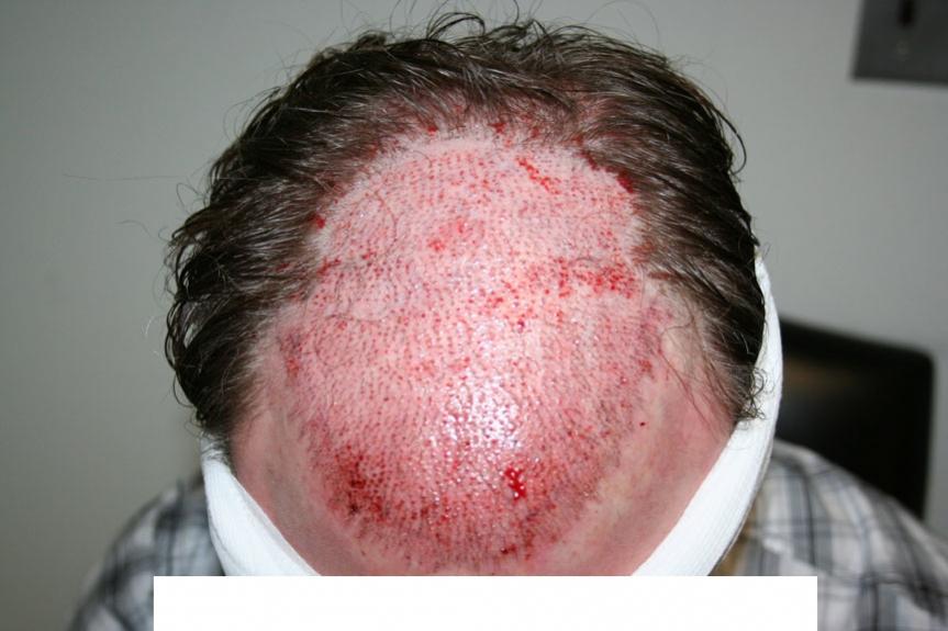 My day was not to go without incident the only one being my anistetic had worn off I didnt realise you was not meant to fell them putting the grafts in, oh well it was only an hour or so of pain after me telling the nurses i couldn't stand the pain the doctor quickly visited me and explained i should not feel any pain at all and I could have as many injections as necessary to numb the pain.... So after around a dozen to the back of my head and the same to the top i was ready to go again. The doctor did advise me when giving the first round of injections that I did have a lot of scar tissue on the top and sides of my head from years of football and rugby which is why the injections wore off so quick. Anyway other than that and having to try and sit still for 6.5 hours when my surgery was over I have never been so happy to see what I actually saw.....................HAIR.... now dont get me wrong I looked like Fryer Tuck with a bad case of sunburn but I was really pleased and so much so I would of walked back to my hotel without a cap and not given a toss who saw me.