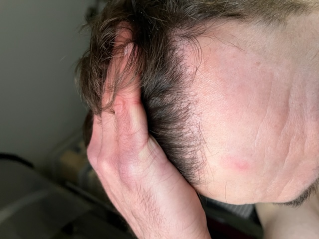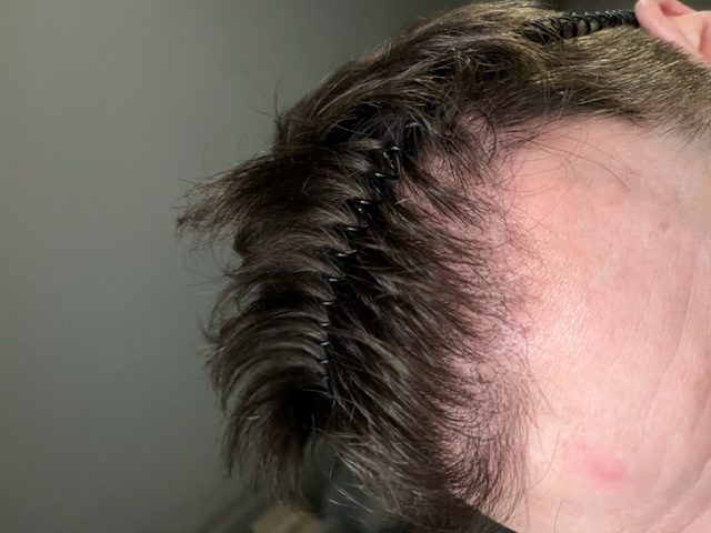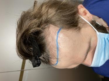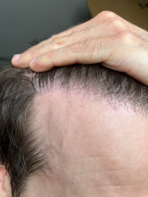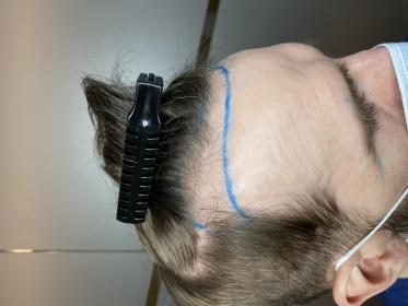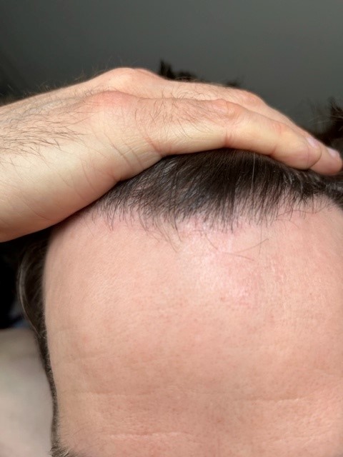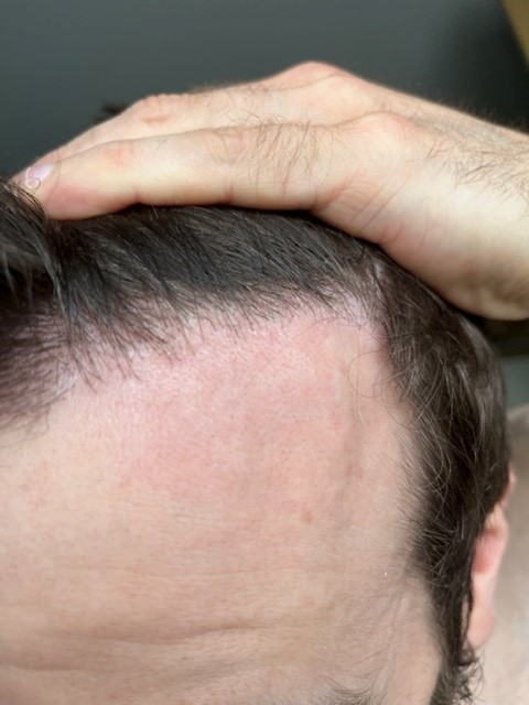 After that, I was taken in to the operating theatre, given some pre-op medication and had my blood pressure taken. There was a local news station playing on the TV which I was trying to follow when Dr Lupanzula came in about 07:15 and said hello. He quickly got changed in to surgical scrubs and led me to his office where we went over my history and discussed my hairline and procedure (all of the pre-op pics attached were taken in the office at this point). I originally mentioned in the online consultation form that I wanted to restore my hairline and temples, but we also discussed whether placing grafts further back to account for the generalised thinning was necessary and you can see that some were placed back here but it was felt not to be the primary focus of the procedure.