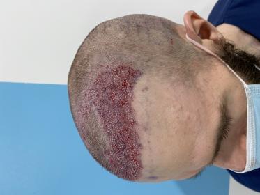 We moved straight on to the implantation part of the procedure and at this point I got to watch a film while the technicians worked. The technicians were the same people that were working at the microscopes during the donor removal phase. There was one working on either side of my head and once or twice they substituted for their colleague. Dr Lupanzula periodically came in to check and see how I was doing and monitor the technicians' work. I'm pretty confident this part took about 4 hours as I got through all of Avengers: Endgame and a good chunk of Contact (a film starring Jodie Foster from 1997) before we finished. Once or twice, the technicians subbed in for each other. I did have the occasional urge to talk to them, but I thought it best to let them get on with it!