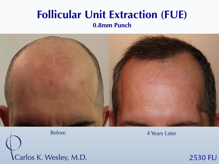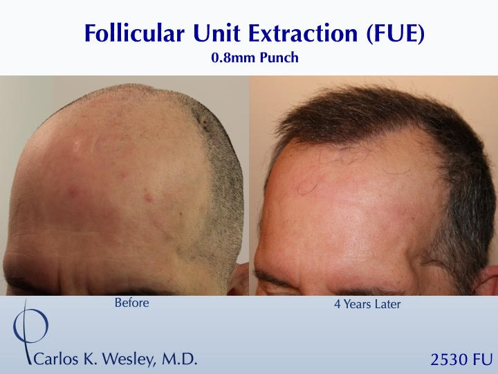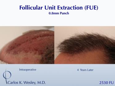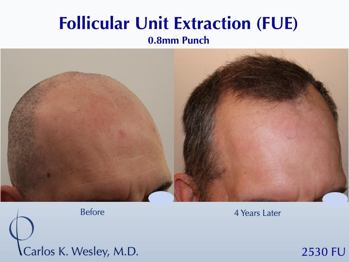 This 43-year-old man underwent a follicular unit extraction (FUE) session with Dr. Carlos K. Wesley in which a total of 2530 grafts were placed within and around his scalp scar.