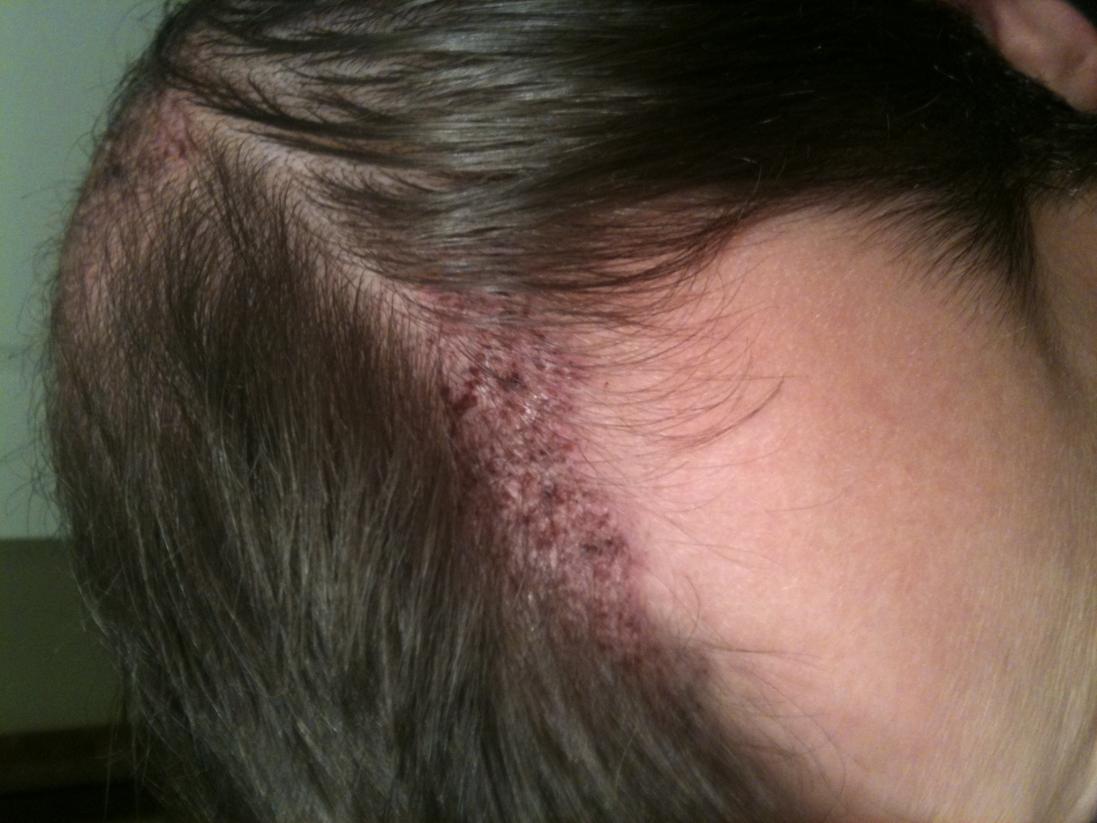 Here is a picture that I took this morning. Keep in mind, I just had this done yesterday, and my head has been in on of those blue, stretchy hospital caps every since he finished, until, I pulled it off to take this picture. It has not been washed, or touched in any way.
