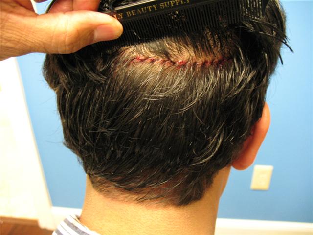 Overall, the procedure is not bad at all. I think that if you allow your anxiety to build up and get stressed out about it beforehand and while you're in the surgical chair, it'll be more difficult than if you just relax and remember that you are in great hands. I did have to keep reminding myself to relax (I only took half of the recommended sedative...probably if I would have chosen to take the full dose, I would have been floating through the process). The worst part is the removal of the strip, in which are your follicular units. I'm not naturally squeamish, but if you are, I recommend that you do not think about it or picture it - honestly it grosses me out. Then, while Dr. Charles' technicians are parsing out the individual follicular units and keeping them viable in saline solution, Dr. Charles went to town on my crown area, making hundreds of tiny incisions at certain angles to replicate the natural swirl of hair that should be there. He encouraged me to keep him updated on how I was doing painwise, and when I started to wince and steel my jaw a bit, I let him know and he re-injected the area with additional anethesthic. I recommend not "gutting it out" even if many of us have the tendency to do that...if it's kinda of hurting you, just let him know. The anethesia (Lidocaine) works immediately once injected. Then, the follicular units were placed in their proper spots. I felt a very tiny and barely perceptible pinch with each one. If you are distracted in conversation or watching TV, you wouldn't really notice it. This part takes the longest time - the placement of the follicular units. Thankfully, I had very minimal bleeding because otherwise it slows down the placement of these units a ton. Follow the Doctor's instructions to minimize blood thinning pre-op. And read over Spex's collection of tips from his experiences. I'd say my procedure took 3.75 hours. It honestly went fast. I chatted with the doctor and technicians, and watched a movie (and some SportsCenter).