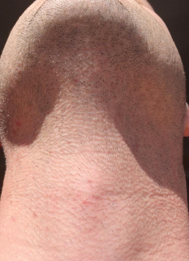 Anyway, I am Sorry for not getting these photos up soon enough. I was having issues with ingrown hairs and pimples. Still a little there but almost gone. I didn't want to display anything sooner due to concerns some would associate that with scaring. Its not. What I've learned is my skin is super sensitive and healed at a slower rate than I expected. Next pass I'll approach the post days much different. I see no signs of scarring via white dots or pitting what so ever. 981 grafts. Fingers are crossed they all grow.