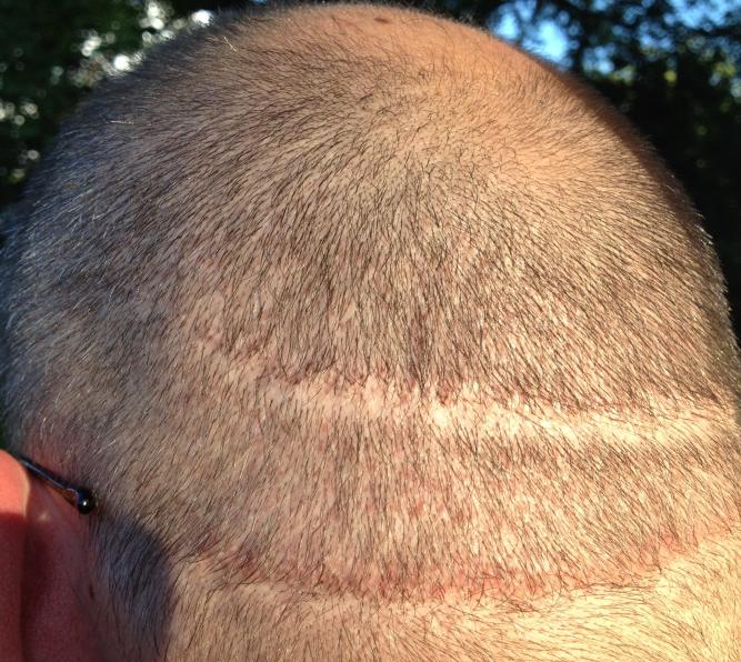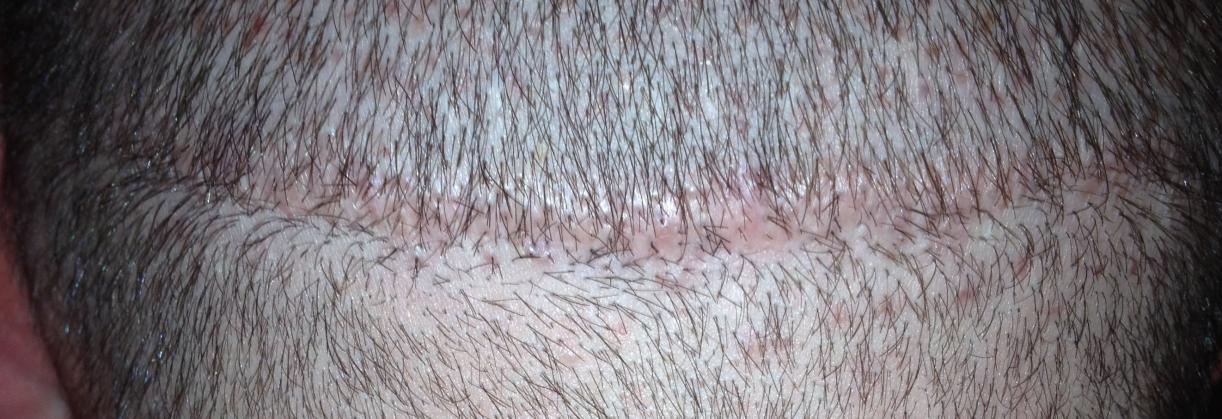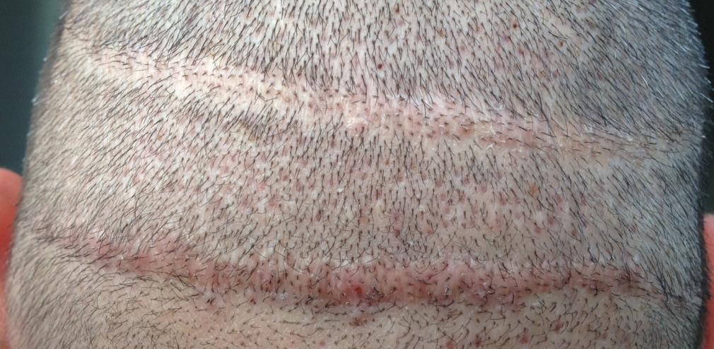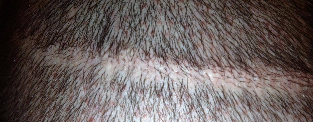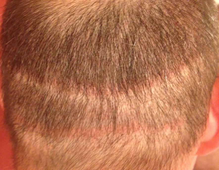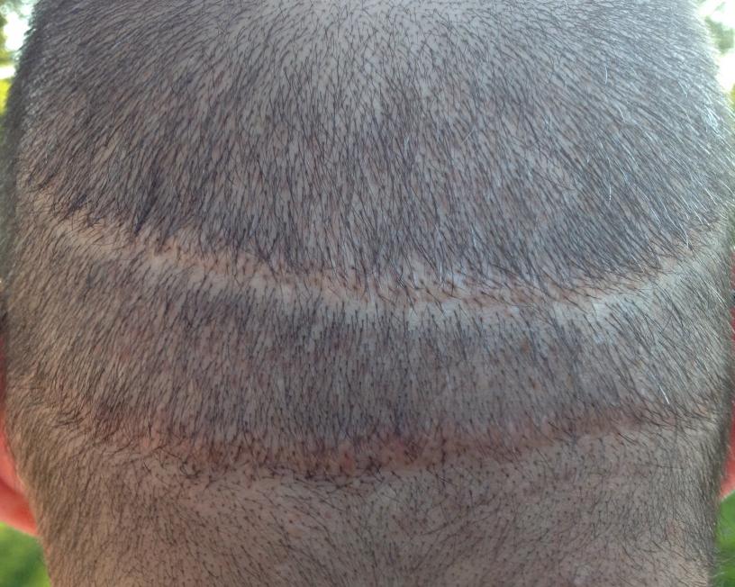 From 1993 to 2000 I had 5 total strip procedures leaving me with 2 large scars on the back of my head. Top scar was 19.5cm x .5cm and bottom was 15.5 x .5cm. Within the last year, my decision to cut my hair extremely short (#2 clipper) became more and more of an interest. I felt it would be the best look considering I was continuing to lose hair. The shortest I was able to previously cut was a #6. My goal is a #2. Obviously the problem with doing this was the exposure of the scars as you can see in the photo.