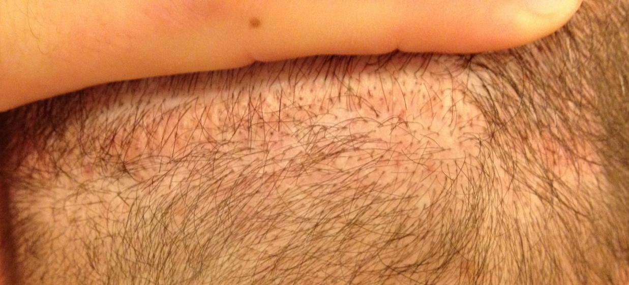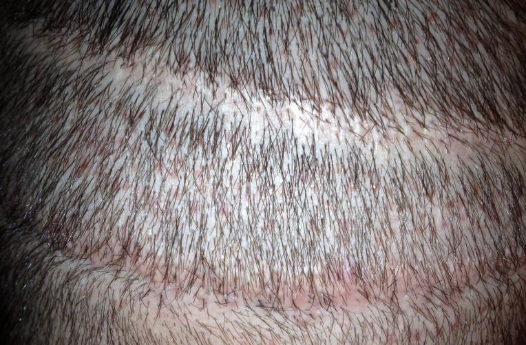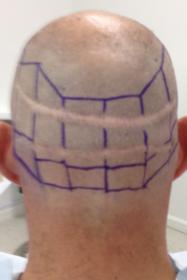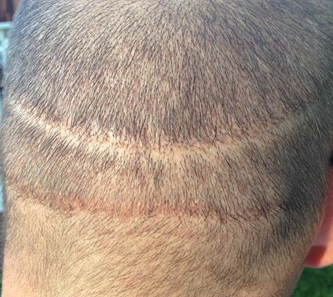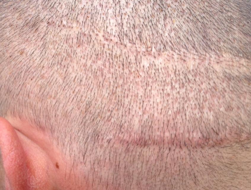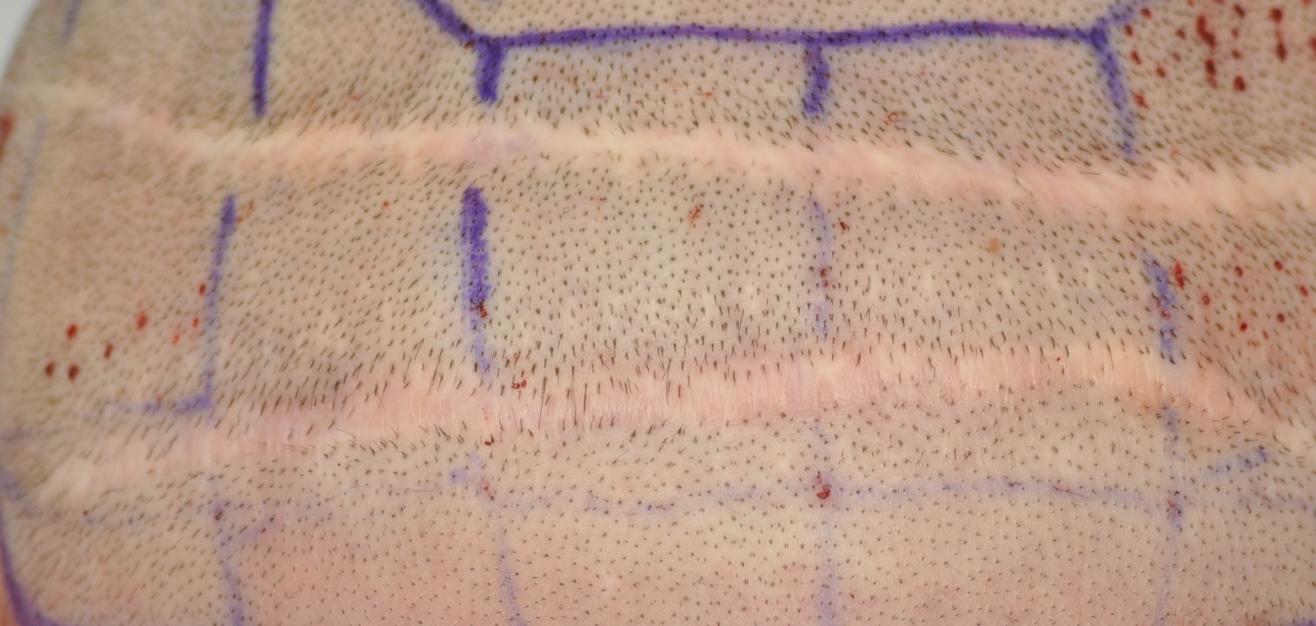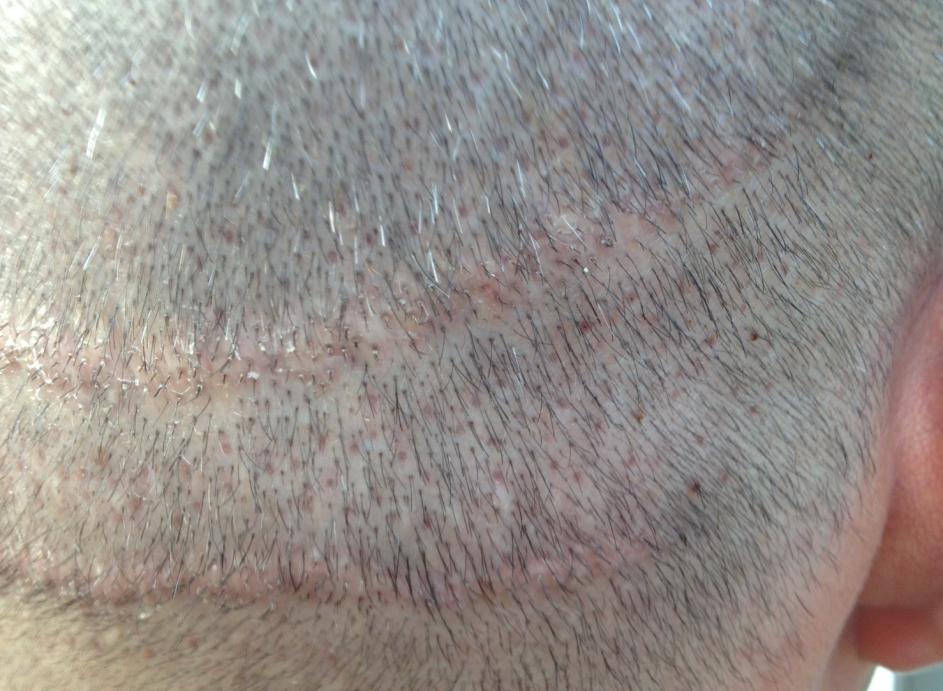 From 1993 to 2000 I had 5 total strip procedures leaving me with 2 large scars on the back of my head. Top scar was 19.5cm x .5cm and bottom was 15.5 x .5cm. Within the last year, my decision to cut my hair extremely short (#2 clipper) became more and more of an interest. I felt it would be the best look considering I was continuing to lose hair. The shortest I was able to previously cut was a #6. My goal is a #2. Obviously the problem with doing this was the exposure of the scars as you can see in the photo.