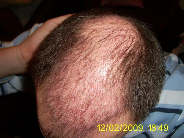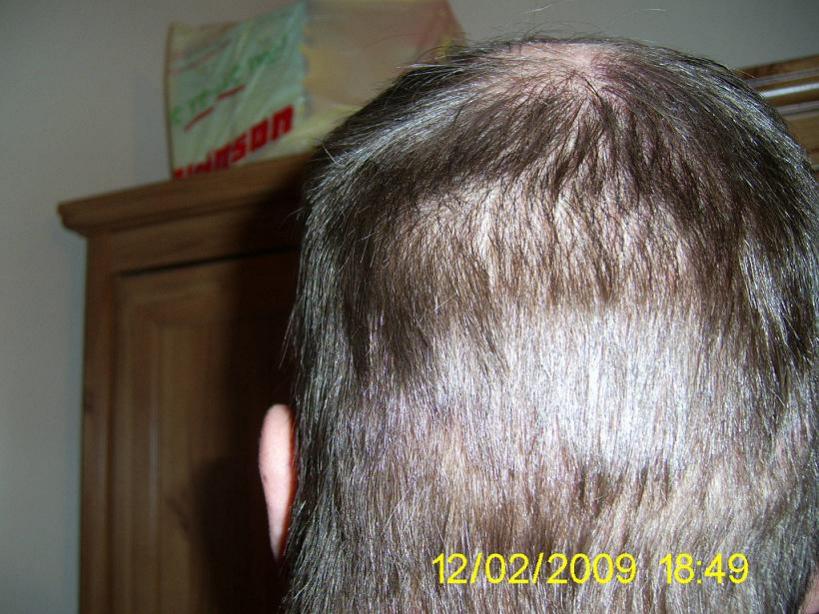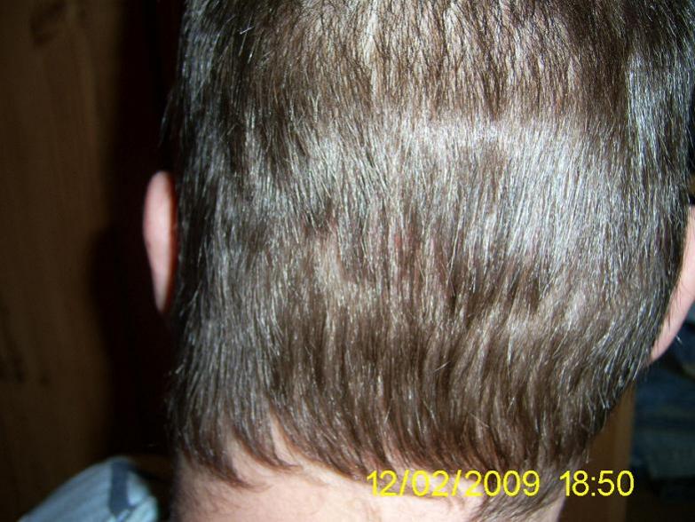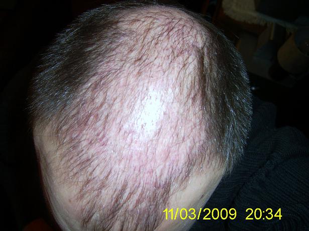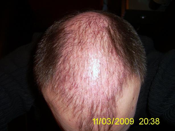 ive just reached the one month mark all my grafts have shed, ive just started using rogaine foam and was checking the other day for inflamation as it was itching(its subsided now though) and noticed if i looked very closely i could see some hairs beginning to sprout, so im very excited at the moment just a shame the camera cant pic them up......any way here are my one month pic guys as promised you folk will be with me every step off the way