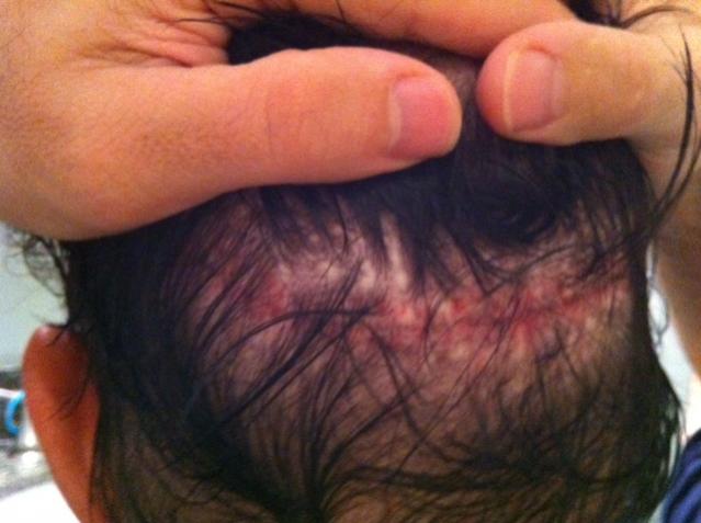 Attached are photos from the day of surgery. The ones with the blue background are before, and the ones with the black background are during/just after. Note the scarred tissue in picture showing where my strip was shaved from the old open donor procedure that I had. Just seeing it makes me so upset that a doctor would have done that to me, but, that is all gone as it was about 95 percent removed when Dr. Cooley took outthe strip (which got us 3300 follicular units, which was way more than other doctors estimated -- thanks I think to my regularscalp stretching exercises that I did extensivelyfor six weeks prior to surgery and an enzyme Dr. Cooley uses to help get more laxity in that area). The scar -- at ten days, is healing nicely and is not noticeable at all due to my hair -- I will take the stitches out at three weeks.
