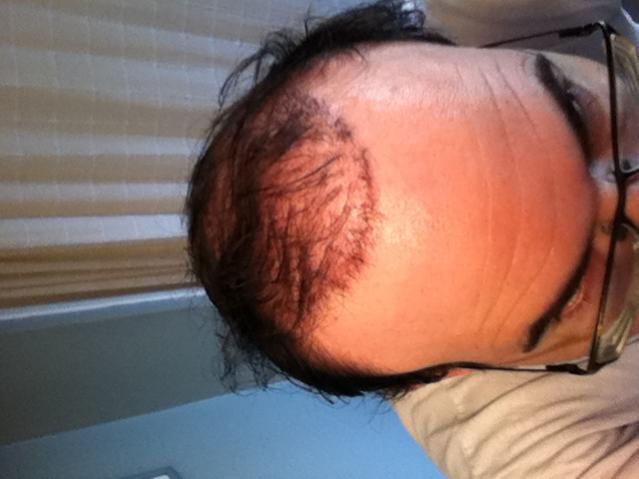 That night, I went to the hotel, had some dinner, took the valium and demoral, used my airline pillow (I recommend this), and slept fine except when I woke up as directed to use a spray to increase blood flow that Dr. Cooley recommends. The next morning, I went to Dr. Cooley's and got shampooed and I couldn't believe it -- I was finally looking at me again (albeit with smaller holes where the row of plugs in the front had been removed/reduced) and not at some guy with a bunch of plugs in his hairline. I told Dr. Cooley that when the holes healed up, I would even be happy if I just look like this (without the grown in hairs from the transplant), as opposed to seeing that half smiley face in the front of my head with pretty much bare flesh behind it. Dr. Cooley said he had heard that many times before before. My scar (75 stitches or so) also feels relatively fine and Dr. Cooley said it looks good, as did some of my friends who looked at it.