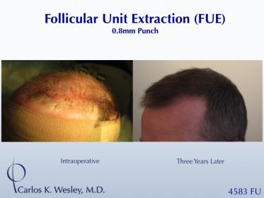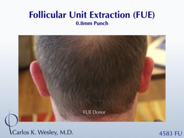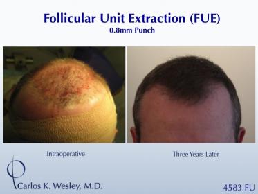 This 45-year-old man underwent 2 separate follicular unit extraction (FUE) sessions with Dr. Carlos K. Wesley in which a total of 4583 grafts were placed. The first session focused on the front of his scalp and the second on his mid scalp.