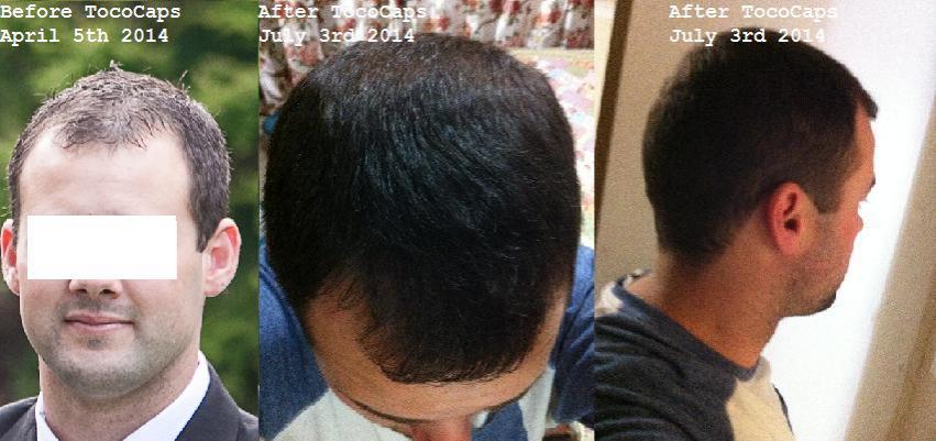This is from a friend using the Wicked Supplements TocoCaps I thought I'd post it in here for you guys. Maybe not the best since it isn't the same angel however you can see a clear difference in the thickness of the hair and coverage, the first picture is pretty thin on top compared to now. Before it grew to the current length when it was cut shorter you were actually able to see it covered more area than the before image.