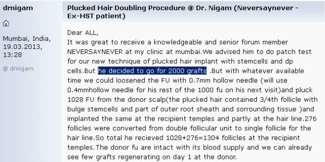 But Dr Nigam didn't only have photoshopped pictures on his website, he lied about his weightloss clinic (claiming it was his wife's, since there were tons of complaints against it, but he was caught on Indian TV claiming that it was actually HIS company). He also defended these photoshopped pictures to be real when he got confronted with them (until he couldn't deny they were fake anymore). And then there are these really pathetic attacks against Dr Gho, with for example that picture of NSN's scalp where he drew all kinds of circles, claiming it was failed regeneration, while most obviously he just randomly drew circles. But also by misrepresenting and totally exaggerating what NSN said, uptil the point where NSN said that Dr Nigam should retract these statements since they were simply not true.