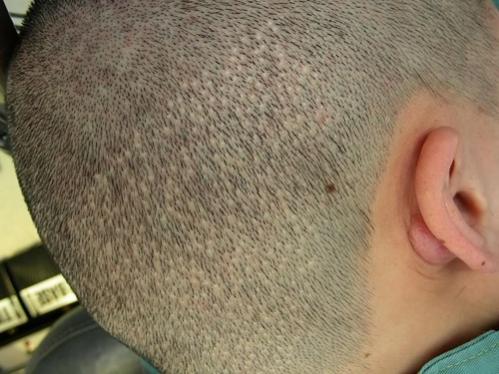 If I'm being honest, if this guy gets a little bit of a tan, all of those white dots are going to show up. It is really good FUE, but I can see that the donor is depleted with white dot scaring even on his very pale skin. By no means does this look bad at all, it looks extremely good to me, but there is scaring. It's plain as day. His skin hides the tiny scars very well. He probably could shave down and still look almost perfect if he doesn't go in the sun.Comment