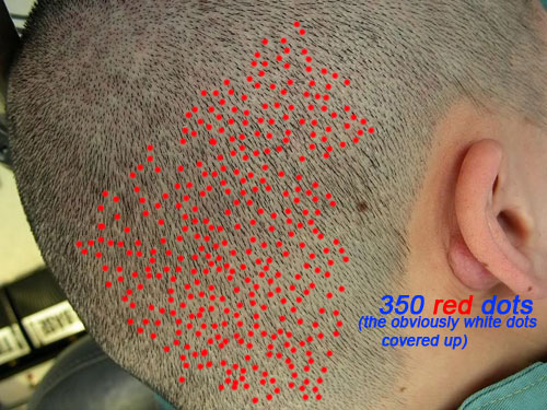 This is a normal FUE donor area result a patient posted in another forum. I tried to cover up all the clear visible white dots (it wasn’t really difficult to do this!) and counted the dots…