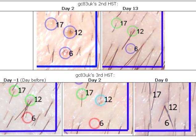 Using Iron Mans circled photo of my day 3 donor, I analysed the aqua and blue circles looking for regrowth on the later day 8 photo. Anyone can do the same, but you can see from below, the red circles show the regrowth and the black circles no growth. I'm sure IronMan will do a much more conclusive version, but I could wait much longer