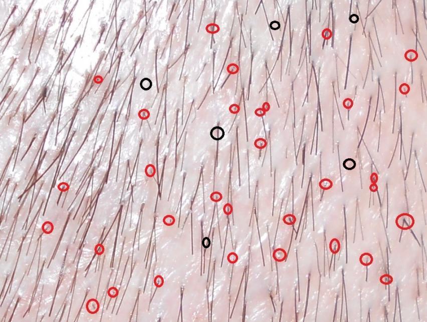 In the above there is 38 points of which 32 are showing regrowth (red), 2 of the black circles I can't be sure because of overlapping hair.
