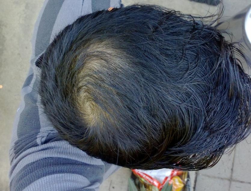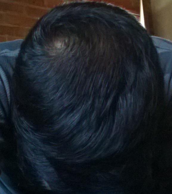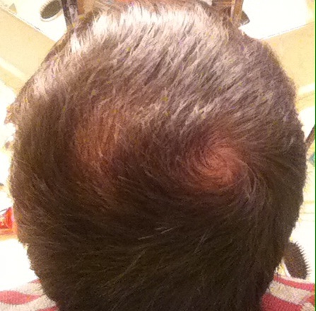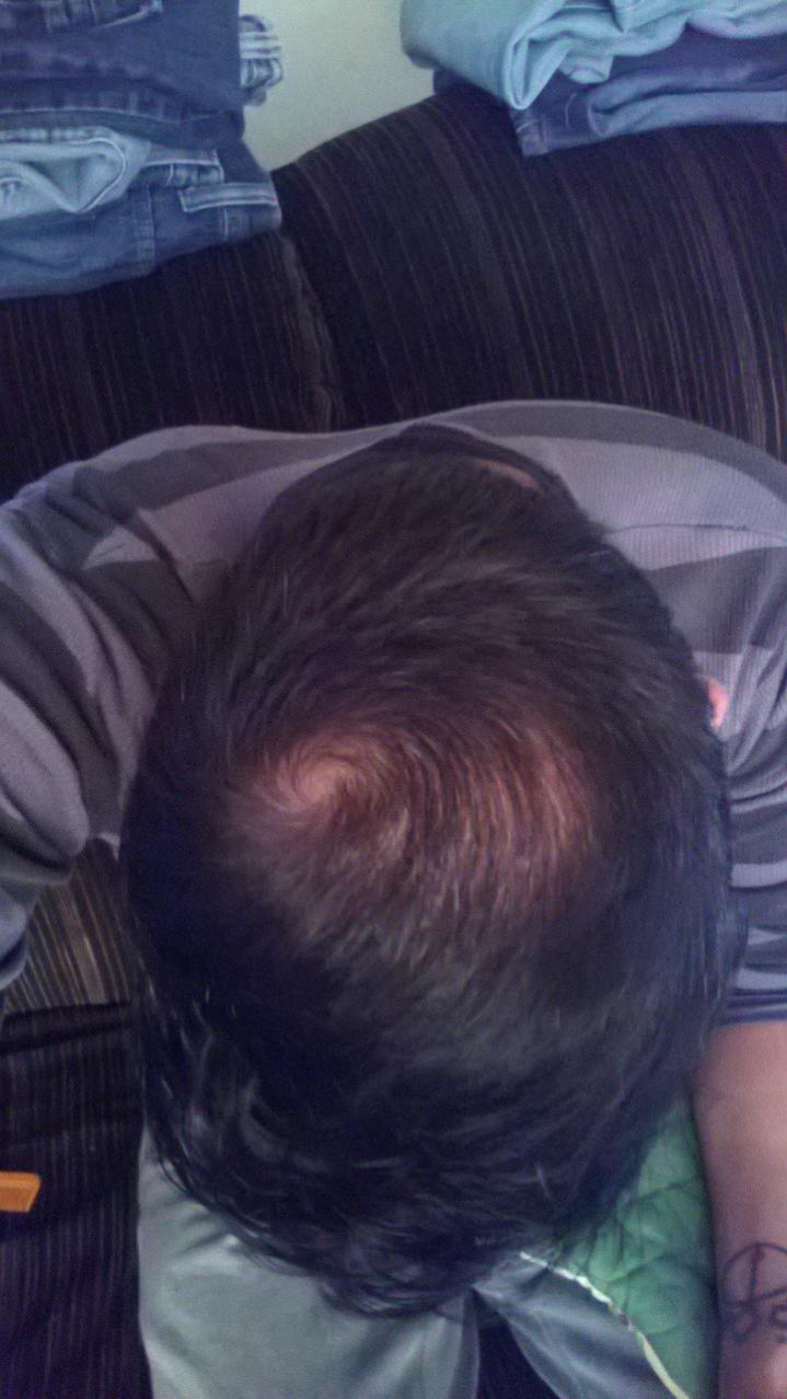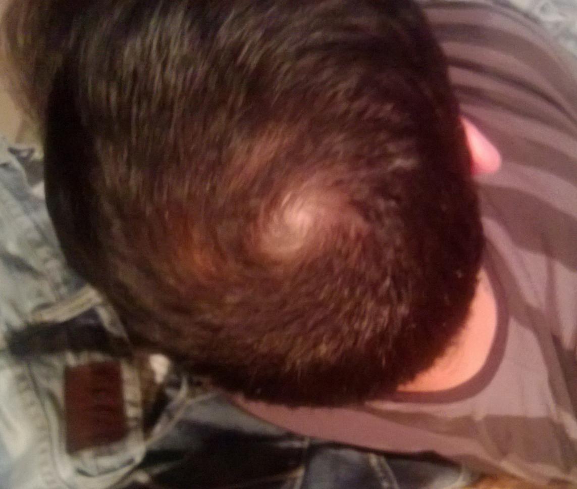 My husband lost his hair pretty bad when he was 19. He was under a lot of stress due to family issues. Ever since it grew back, he has become obsessed with never losing it again. This past year we lost our jobs, and our son. Needless to say the stress has returned, and so has the hair loss. He thinks it is male pattern baldness and has been very depressed. I think it is stress related again, but he says last time he lost his hair in the front. This time it's near his cowlick. I've decided to post some pictures (with his permission) to see what everyone else thinks. There is no loss in the front, or anywhere else, just the one spot.