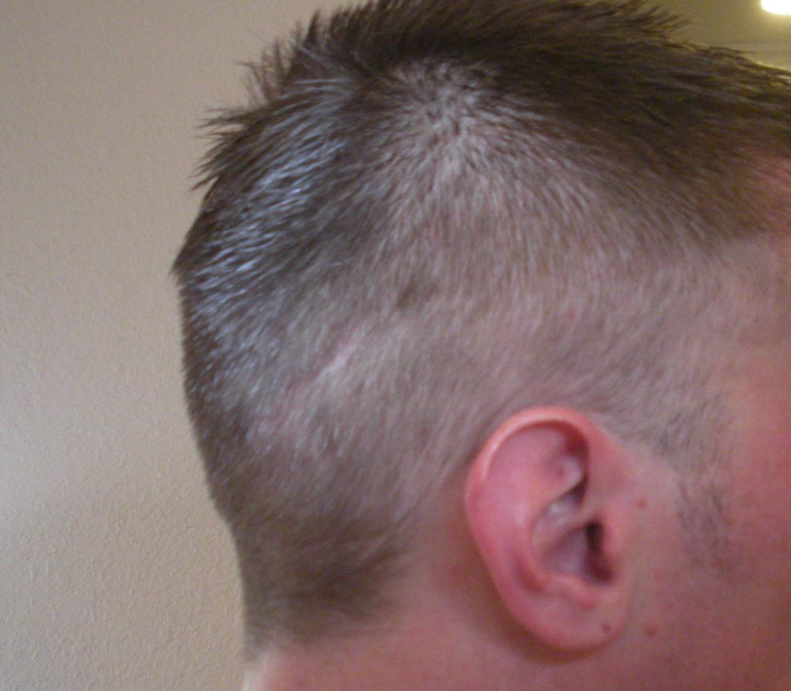 Matt - The fade goes from a #1 to #2/3 (at the scar) to a #8 on top. Sort of like a slightly grown out High & Tight Marine style. My brother saw me and and yelled Semper Fi! He does not know about the HT and didn't notice the scar (or he would have given me sh*t, believe me).Comment