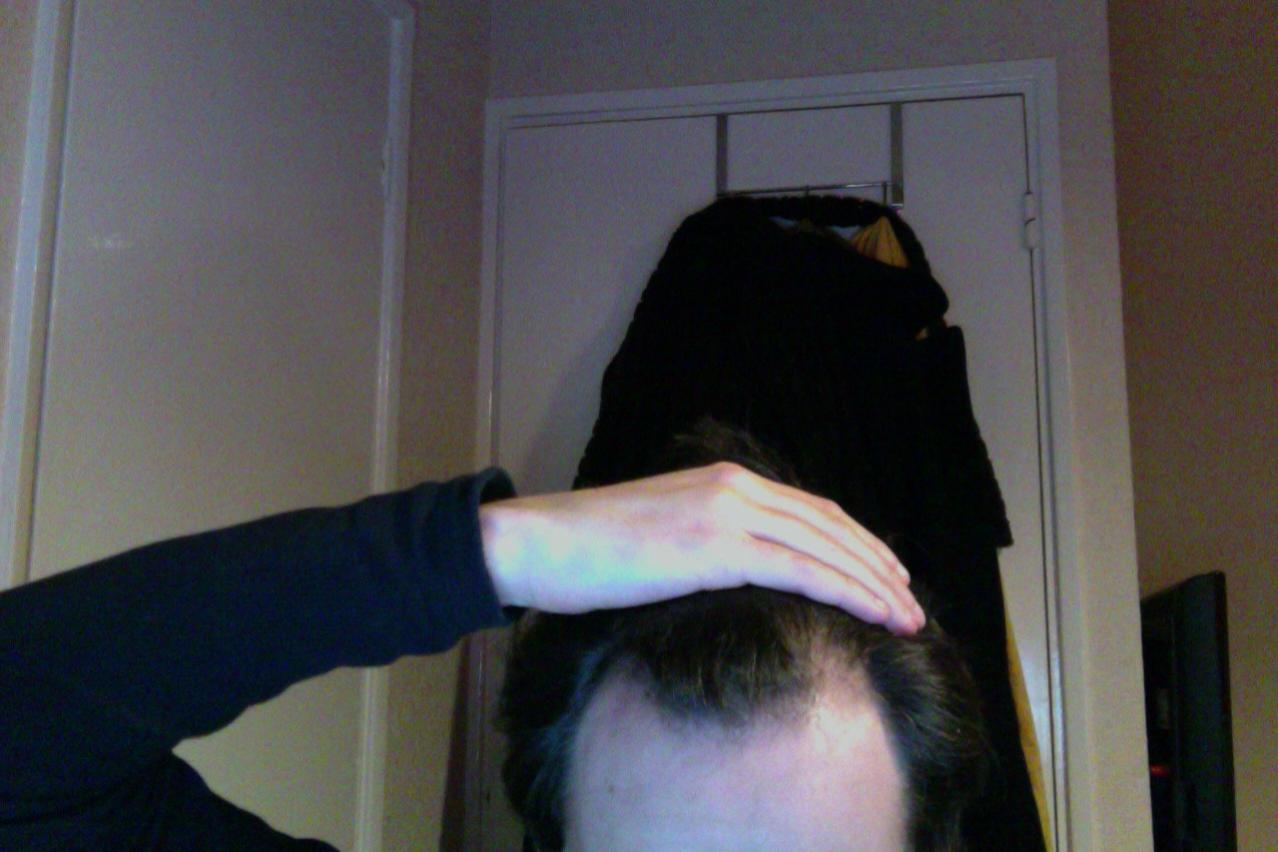 22 and as you can see quite badly receding. i've been receding now for about 2 years. My temple area is completely going and my front hair is thinning rapidly. the rest of my hair seems ok and pretty thick.