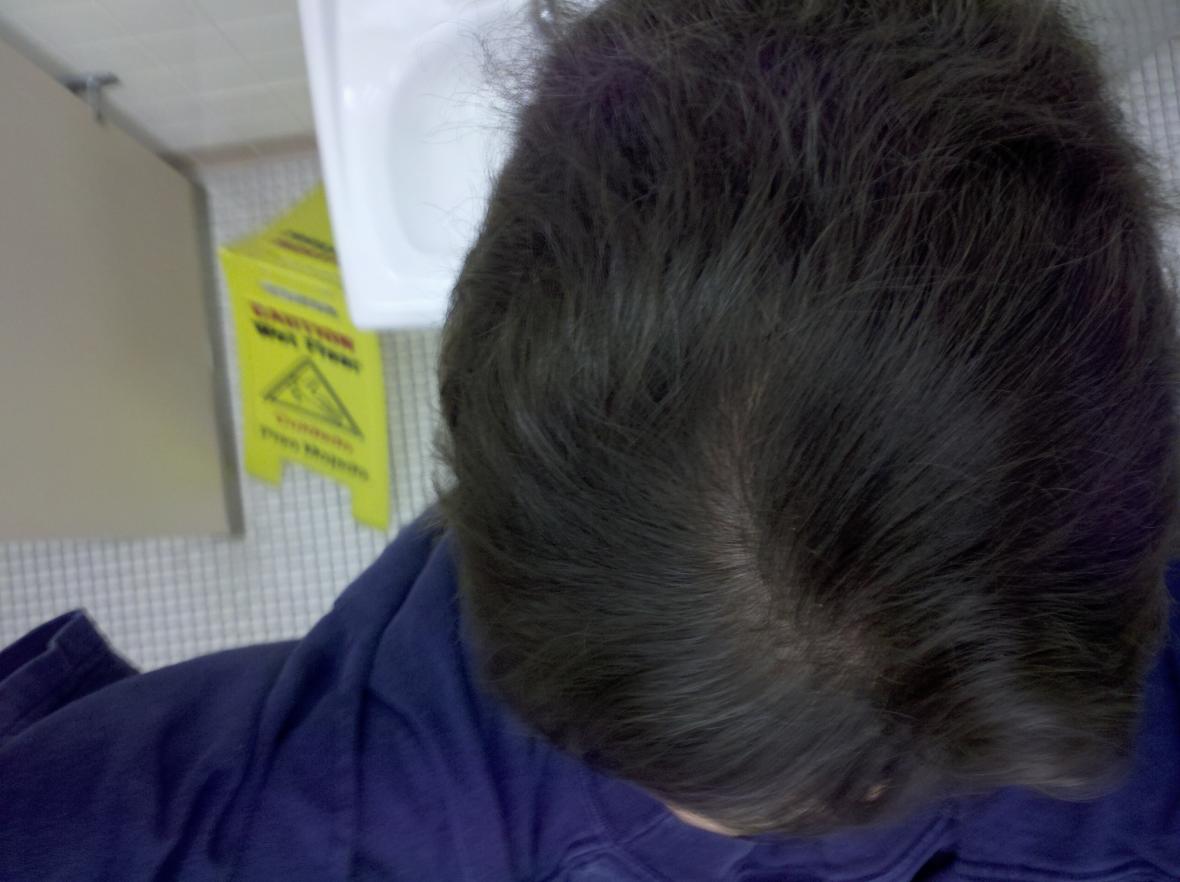 I just turned 39 and have always had a strange split in the middle, due to not sure, maybe a cowlick, of my head but just wanted your opinion...does this look like thinning going on here & if so, is this something that if I put Rogaine in there, that it could have a possible result? My wife thinks there isn't any thinning but I'm in denial or maybe just stupid