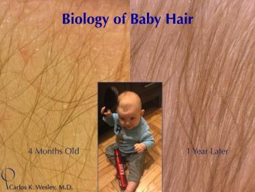 A fun slide of Dr. Wesley’s son’s hair at 4 mos old and 1 year old under magnification.