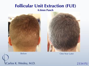 This 27-year-old man underwent a follicular unit extraction (FUE) session with Dr. Carlos K. Wesley in which a total of 2334 grafts were placed.