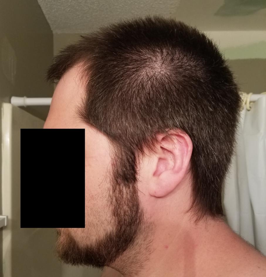 I've attached pictures which shows this loss. My hair is slightly damp as I had gotten out of the shower not too long ago. It's about 1 inch long (#8 buzzcut). I've also attached photos of my front and top for reference. Have any of you ever seen that type of thinning on the sides of the head on other people before?