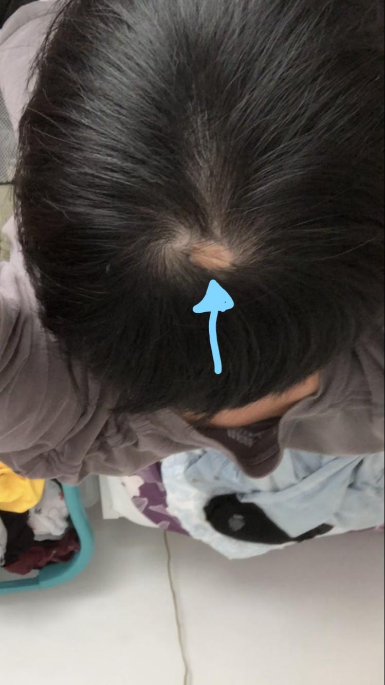Hello, I have a birthmark on top of my head at birth that I have had since birth (arrow is pointing to it in picture). From what I remember, small areas around it never had hair, but I never took a picture to compare from back then.