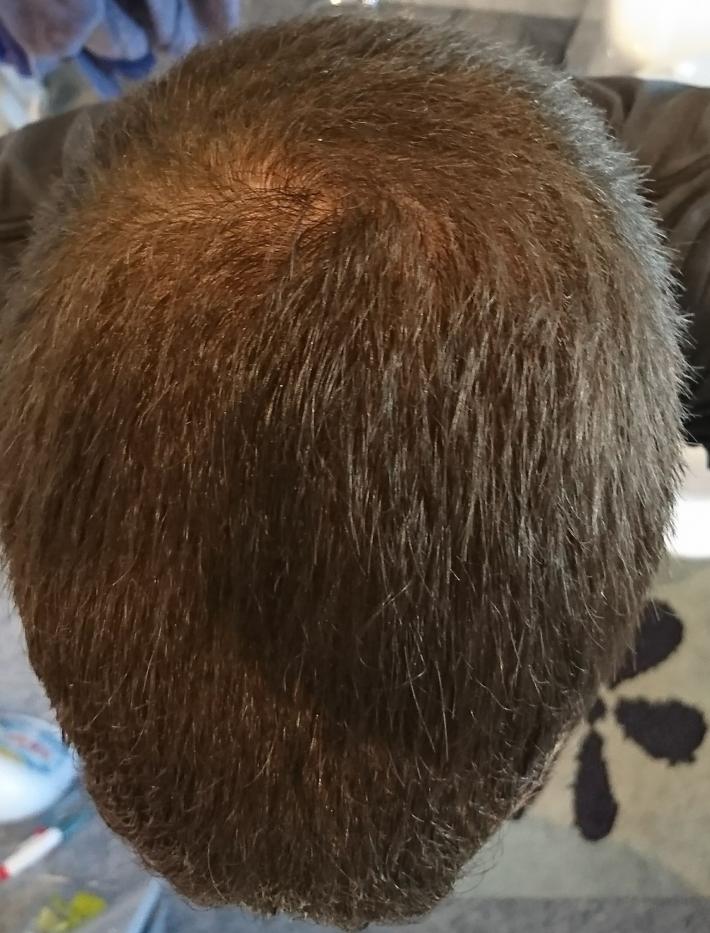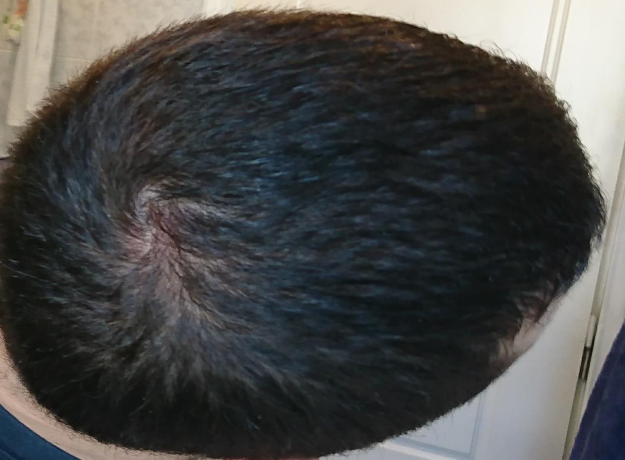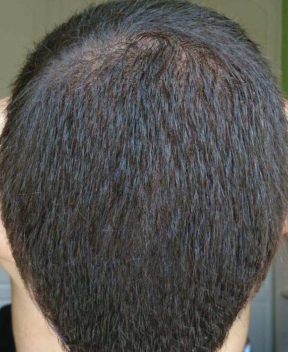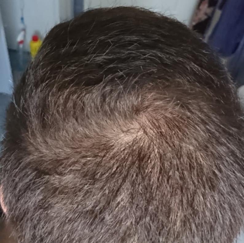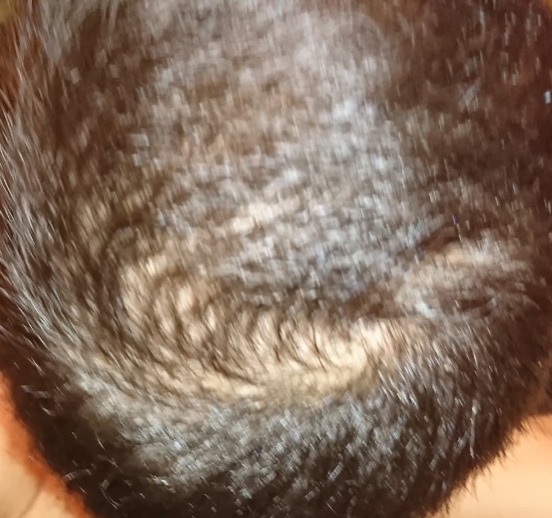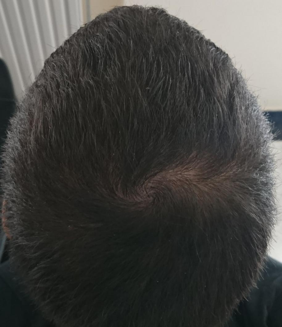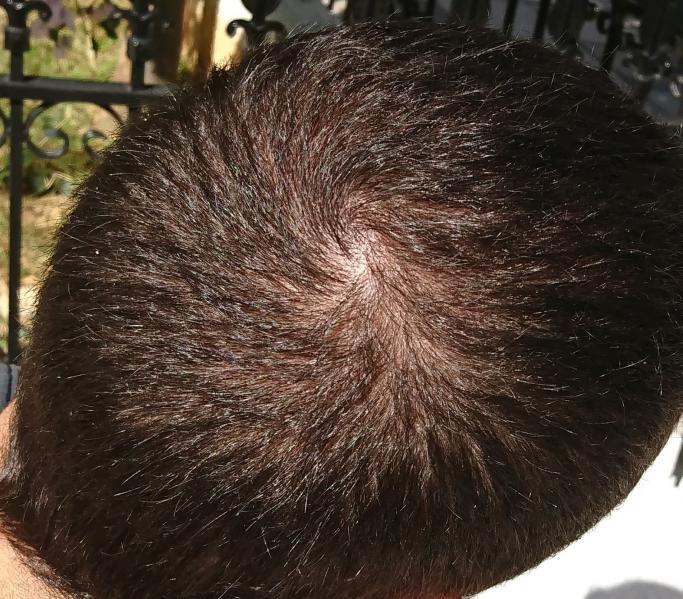 Seems like a natural hair whorl to me. I have the same thing. It does not look like it is thinning to me. If you are concerned, you can apply Toppik to that area and it would completely cover up any visible scalp (keratin fibers binding to your existing hairs will fatten up the shafts of the follicle) Keep an eye on this area, you can also use a 0.25mm to 0.5mm dermaroller with Jamaican Castor Oil, or Minoxidil. Good luck!