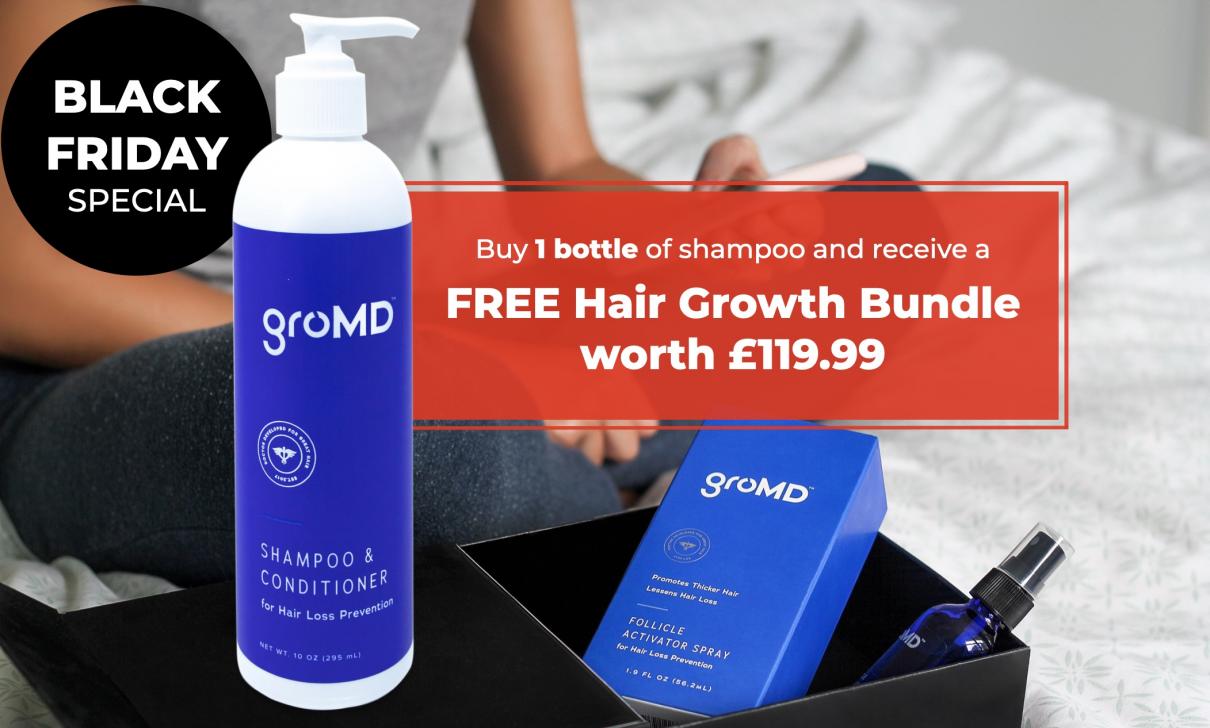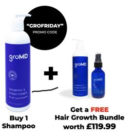 I have to say it's a superb offer - when you buy a single bottle of shampoo you'll receive a FREE hair growth bundle containing a second bottle of shampoo and a bottle of activator spray. In summary, for £59.99 you're getting £179 worth of groMD product!!