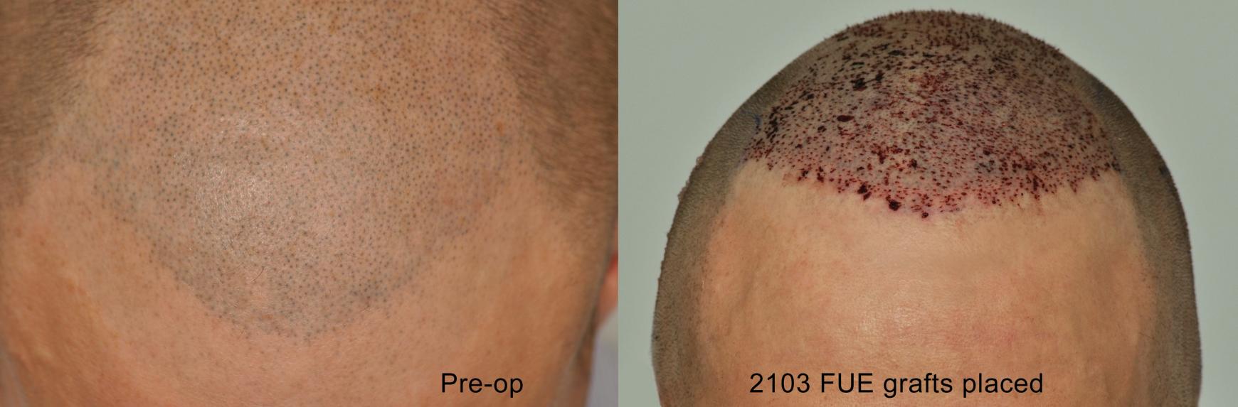 Below, I attached a side by side photo of our patient who had SMP several years ago. As his hair continued to thin on top, the SMP appeared less natural up close. As a solution, he had 2103 grafts placed in the frontal area.